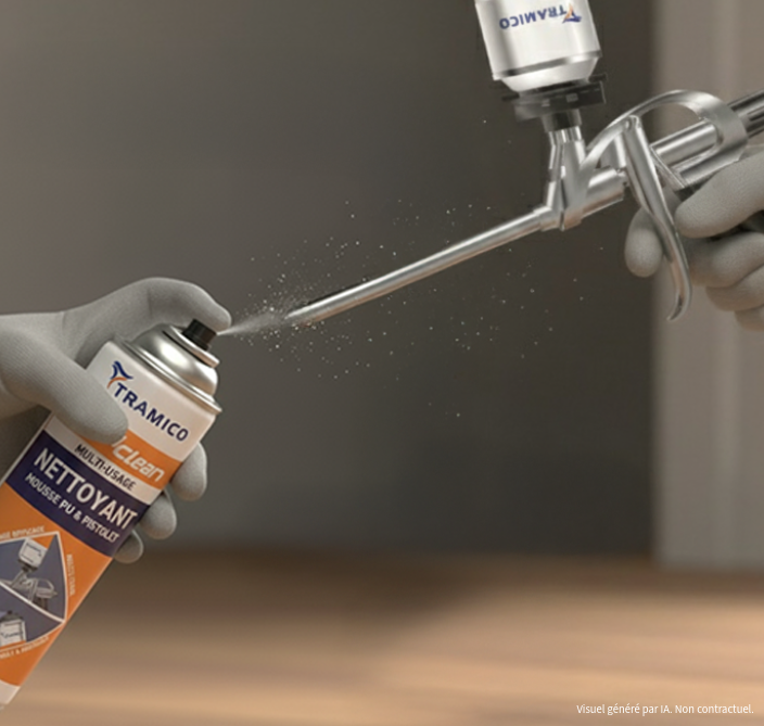 TRAMICLEAN nettoie en profondeur l’intérieur et l’extérieur des pistolets à mousse PU. Il permet d’éliminer efficacement les résidus de mousse non durcie. Un entretien régulier garantit des performances optimales et prévient tout encrassement prématuré des pistolets.